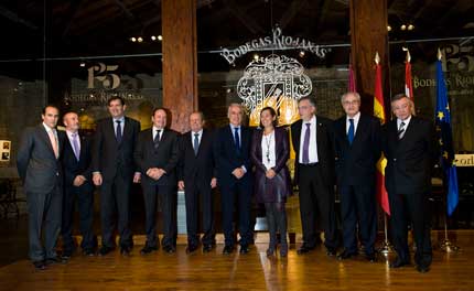 Autoridades de las Comunidades de La Rioja, Castilla León y Galicia junto a los directivos de Bodegas Riojanas en el acto institucional celebrado en las centenarias instalaciones de la bodega en Cenicero.