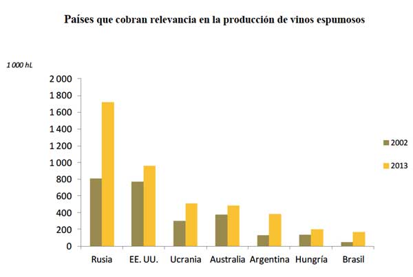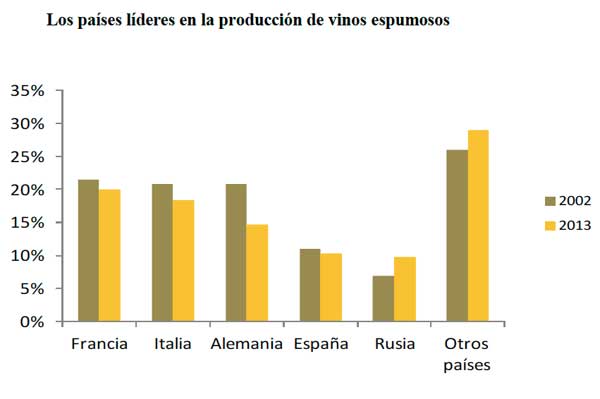 Otro aspecto interesante es la diversificación de la producción de vinos espumosos, mientras que en 2000, el 74% de los vinos espumosos era producido por cuatro países de la UE (Francia, Italia, Alemania y España), en el año 2013 estos países no aportan más que el 63%.