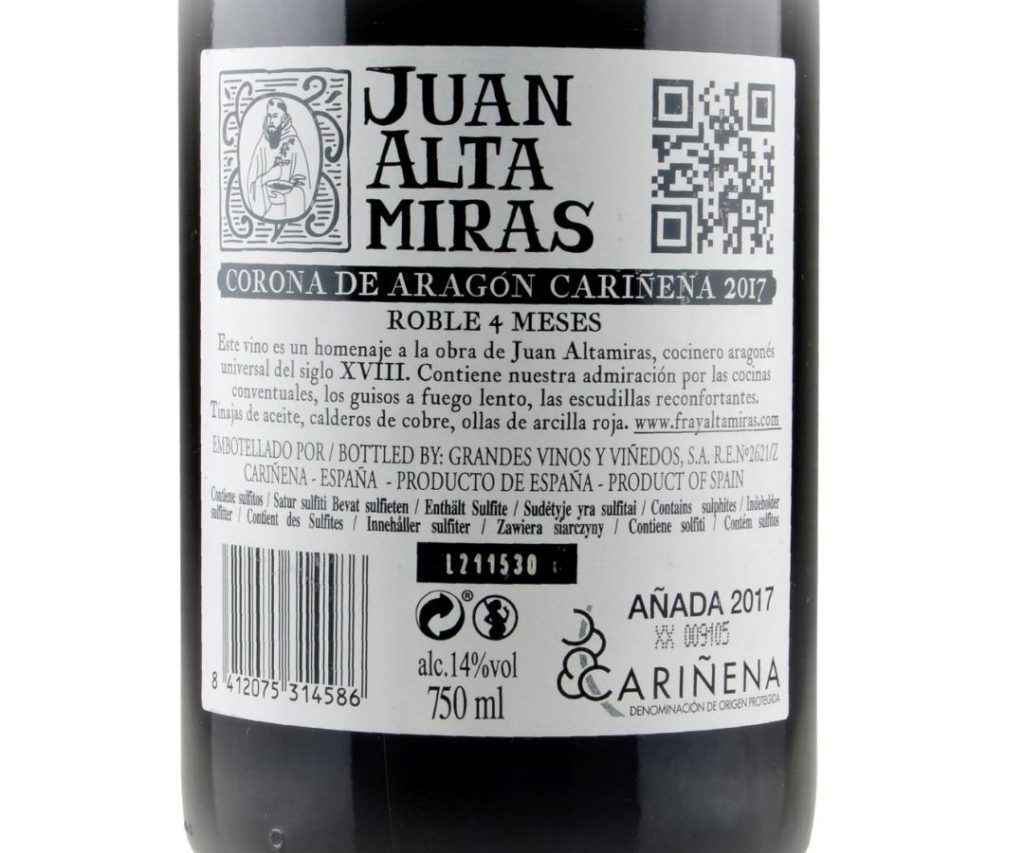 Se trata de un monovarietal cariñena 100%, la única variedad del mundo que toma su nombre de su lugar de origen, donde habitó y falleció Juan Altamiras, cocinero y fraile franciscano aragonés del siglo XVIII, visionario de la cocina contemporánea y autor del libro Nuevo arte de cocina, sacado de la Escuela de la Experiencia Económica (1745).