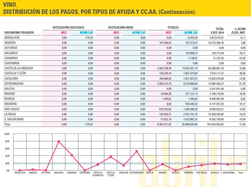 En lo que va de ejercicio -desde octubre del año pasado hasta abril de 2015-, los pagos ascendieron a 3,38 millones para promoción en terceros países; 18,97 millones para reestructuración y reconversión; casi 3,15 millones para inversiones y 7,96 millones de euros para destilación.