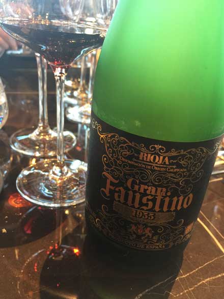 Los cimientos para elaborarlo se ponen ahí, su abuelo le contaba que del 40 al 50, fueron años muy malos, de una climatología muy gélida y por tanto no podía hacer el sueño que él quería. Ya en 1952 «hubo una cosecha razonable pero no le debió de gustar el resultado y en el 55 logró ese vino que tenía ese potencial». De curiosidad innata «el abuelo se fijó en los franceses que tenían mucha fama con el vino y ¿qué usaban?: barricas francesas. Fue el primer hombre en Rioja que compró barricas francesas donde almacenó y cuidó este Gran Faustino 1955″. Gran Faustino 1955 nació con una etiqueta grana y oro y «en bodega teníamos 2555 botellas y hemos querido actualizar la vestimenta a los tiempos: negro y oro», proseguía la consejera de Grupo Faustino.