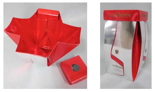 El packaging del champán GH Mumm tiene una doble utilidad, proteger y mostrar el producto pero además sirve para enfriar en producto puesto que se convierte en cubitera al abrirse. De forma que permite llenar el packaging con agua, hielo y la botella.