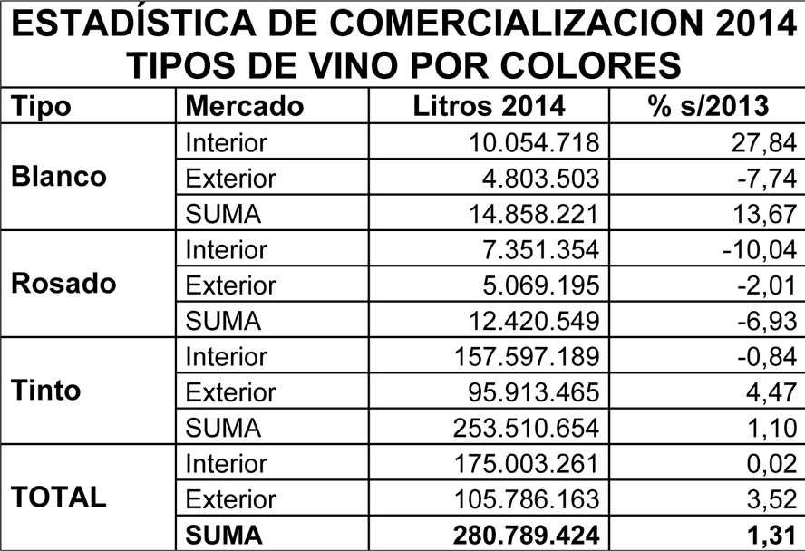 En síntesis, la D.O. Calificada Rioja ha comercializado en el año 2014 un total de 280.789.424 millones de litros, el 90% de los cuales corresponden a vinos tintos (253,5 M. de l.), repartiéndose el resto los vinos rosados (12,42 M. de l.) y los blancos, que con 14,85 M. de l. son los que han tenido mayor aumento porcentual (13,67%).