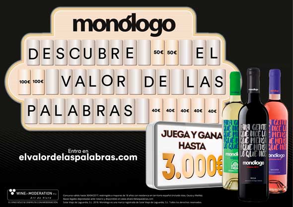 Además, ahora disfrutar de Monologo puede tener premio, ya que Monologo Vino lanza en el punto de venta la promoción “El valor de las palabras” en la que sus consumidores pueden ganar premios instantáneos en metálico cada día y optar a un premio de 3.000 euros en el sorteo final. Para participar sólo hay que entrar en www.elvalordelaspalabras.com y registrarse.