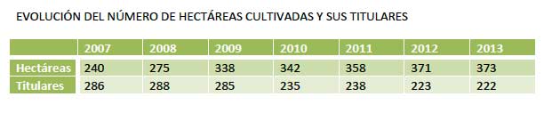 El número de hectáreas dedicadas al cultivo de la vid ha mantenido su tendencia ascendente, mientras el número de sus titulares sigue en progresión descendente aunque en los últimos años tiende a estabilizarse A fecha de hoy el número de viticultores inscritos es de 222 con 373 hectáreas cultivadas