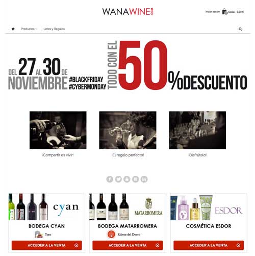Lo lanza el Grupo Matarromera y ha elegido para su puesta en marcha coincidir con los denominados Blackfriday y el Cybermonday. Por ello todos los productos de Wanawine estarán desde el viernes 27 de noviembre de 2015 hasta el lunes de la próxima semana al 50%. La tienda pondrá, a disposición de las personas inscritas a la misma, numerosas ofertas y promociones de los productos, sobre todo de cara a las fechas navideñas.
