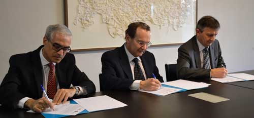 El rector de la UNIR, José María Vázquez, el presidente de FDI Payment Institution, Dominique Chetelin, y el gerente del Grupo Rioja, José Luis Benítez, han suscrito el convenio de colaboración entre las tres entidades que permitirá investigar una de las áreas más desconocidas del negocio vitivinícola.