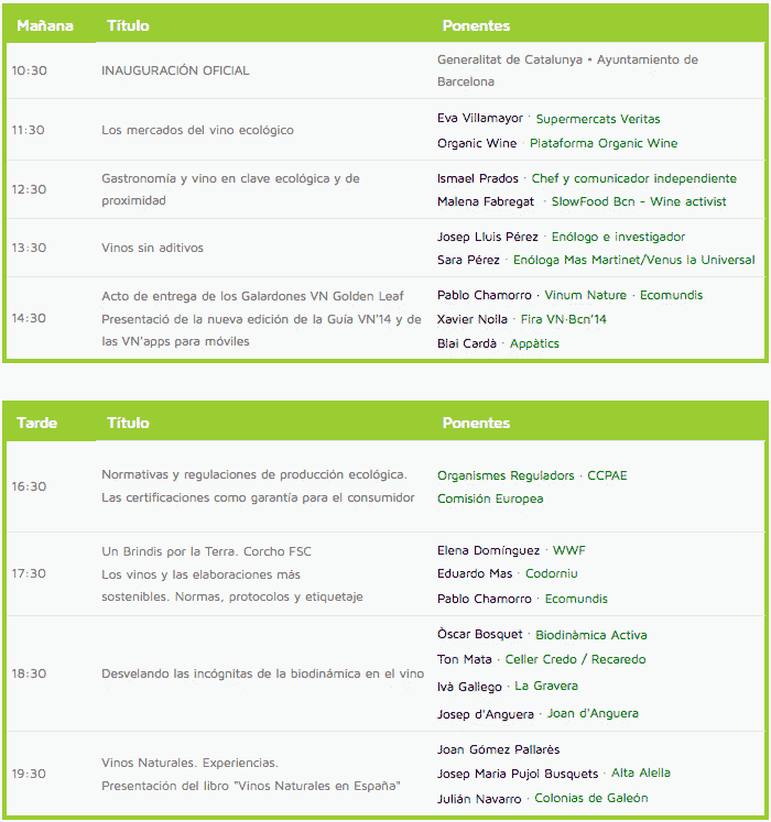 Las ponencias técnicas se impartirán por expertos destacados del mundo del vino. Entre ellos, Sara Pérez (Dominio do Bibei), Ton Mata (Bodegas Recaredo), Joan Rubió, Ferran Centelles (Wineissocial), Joan Valencia (Cuve 3.000), Ismael Prados (cocinero), Joan Gómez Pallarès (De Vinis), Óscar Bosquet (Biodinamicaactiva.com), Xavi Nolla (sumiller). Los bodegueros, además, compartirán sus conocimientos y experiencias y WWF (World Wildlife Fund for Nature), ofrecerá información sobre los conceptos de proximidad SlowFood y de sostenibilidad.